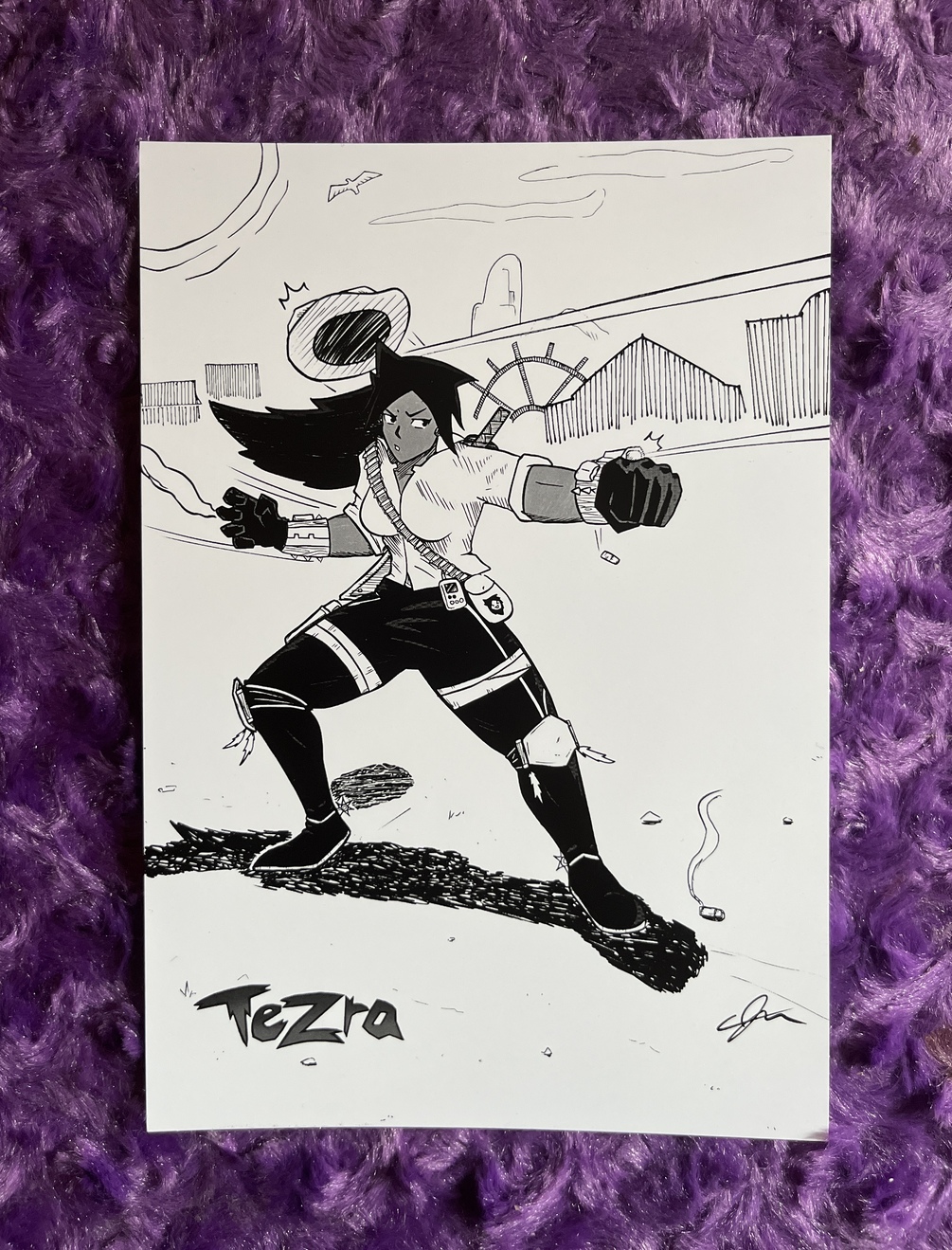 5.5 x 8 in Black and White Art print of cowboy Tezra in the midst of a duel!