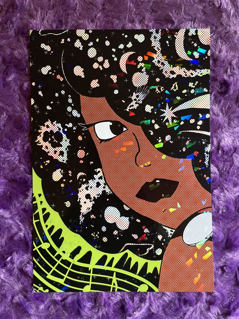 A holographic print of Roxy Topaz the pop star, my original character. She's an alien and she's a star. An Alien Superstar, if you will.